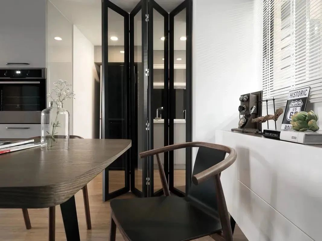 折疊門關(guān)起時(shí),可以清晰劃分空間功能,完全打開后,又讓兩個(gè)相鄰空間變?yōu)橐粋(gè)整體,空間劃分更加靈活,且有助于空間通透性的塑造。