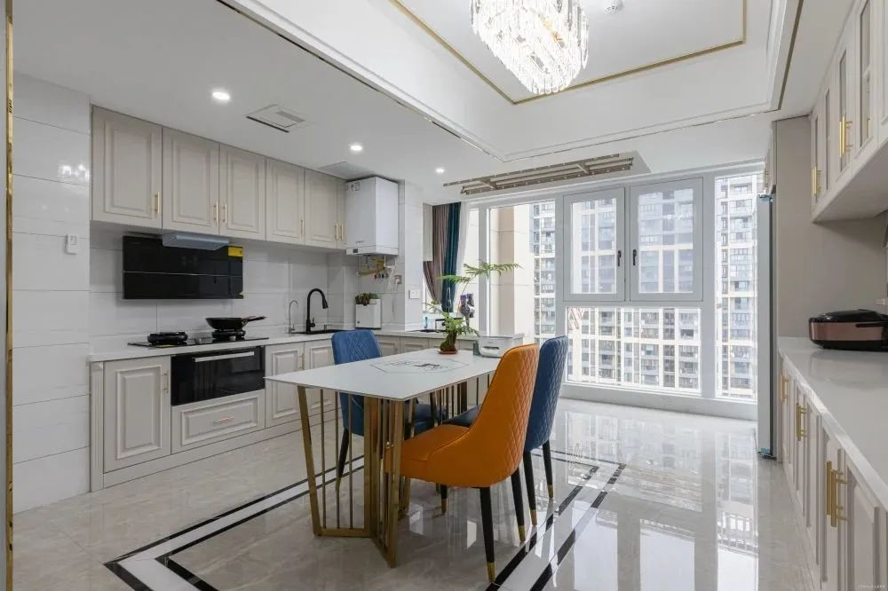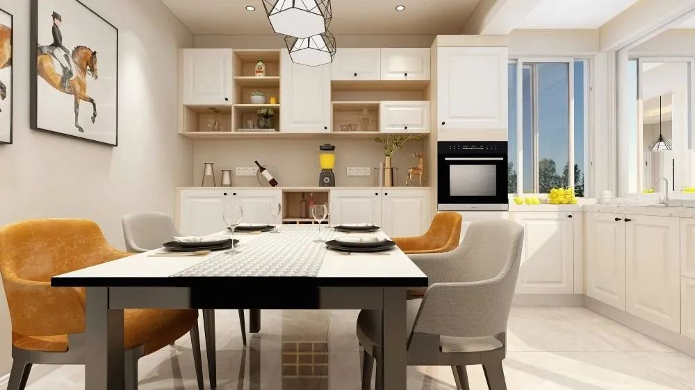 把餐廳和廚房作為一個(gè)統(tǒng)一的空間來(lái)做規(guī)劃,餐廳緊挨廚房,實(shí)現(xiàn)餐廚一體化設(shè)計(jì),提高空間利用率。
